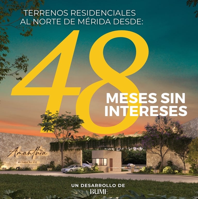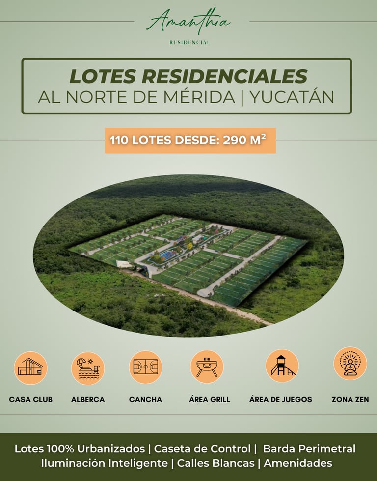Amanthia es un desarrollo residencial exclusivo al norte de Mérida. Un entorno tranquilo, rodeado de naturaleza y pensado para construir tu hogar con calidad, diseño y plusvalía.