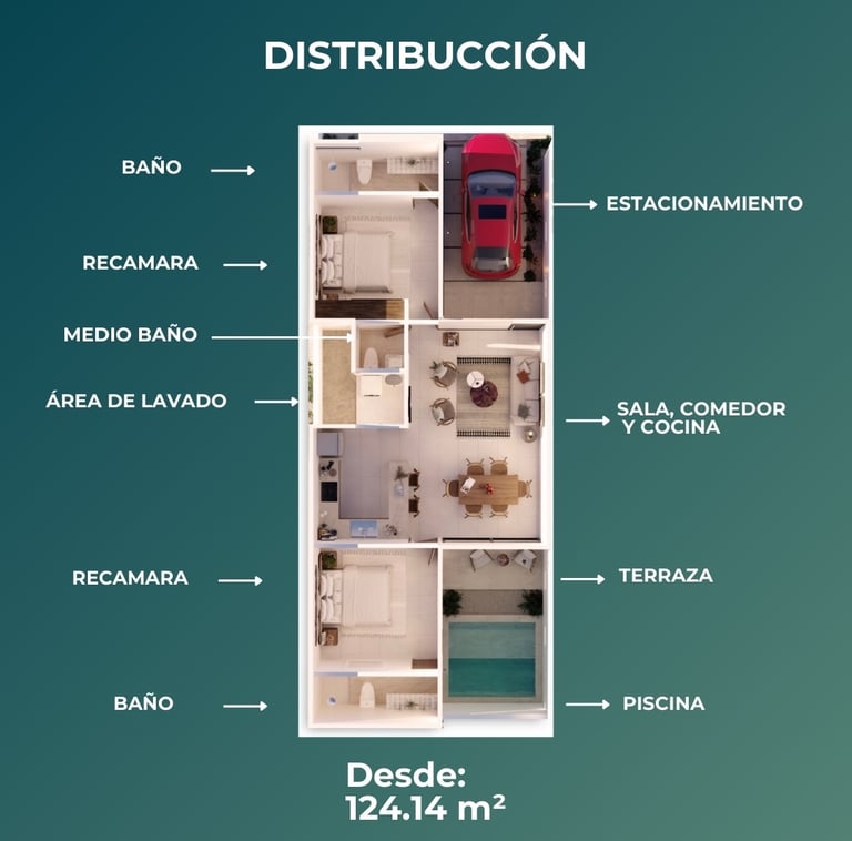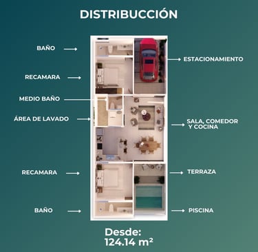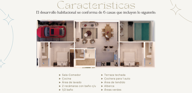 Cada casa cuenta con sala-comedor, cocina, área de lavado, 2 recámaras con baño propio, medio baño de visitas, terraza techada, alberca, jardín, área de tendido y cochera.